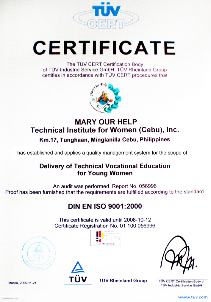 In 2005, Mary Our Help Technical Institute for Women (Cebu), Inc. (MOHTIW) has been awarded its first accreditation by the International Standard Organization (ISO) – TÜV Rheinland, a leading international technical service provider and a certifying body for world class quality of products and services.